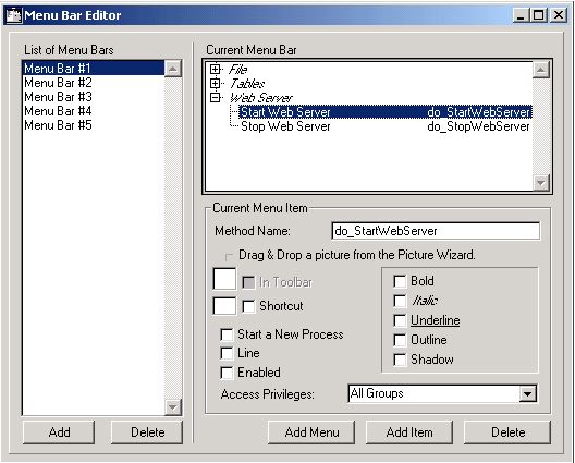 For example, lets say you have a couple of menu items that allow the user to turn the web server on an off as follows: