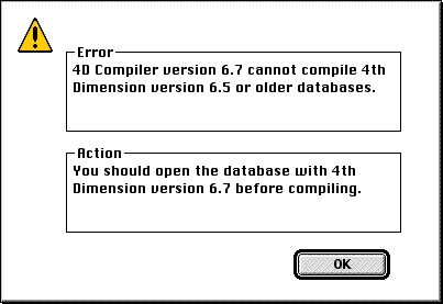 When upgrading a database it is a common procedure to duplicate the database's folder and to open it using the version you want to upgrade to. If you do that, open the project file using the upgraded version of 4D and attempt to recompile the database, the following alert is displayed: