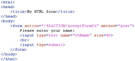 When this form is submitted by a web browser, the project method AcceptForm01 executes and 4D will fill the process variable "vtName" with the submitted value which can then be accessed from the code.