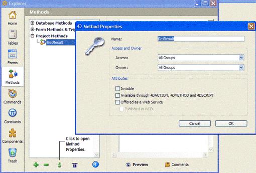 In 4D 2004, there is a new icon in the Explorer window that allows you to easily open up the Properties window of the method selected. The 'i' button shown below becomes clickable only if you select a project method in the Project Methods list. The Method Properties window is displayed when this button is selected as illustrated below.