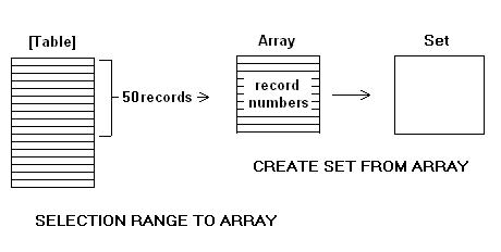 SELECTION RANGE TO ARRAY(1+($MaxSetSize*($setNum-1));$MaxSetSize*$setNum;[Table];$recNumAr)
