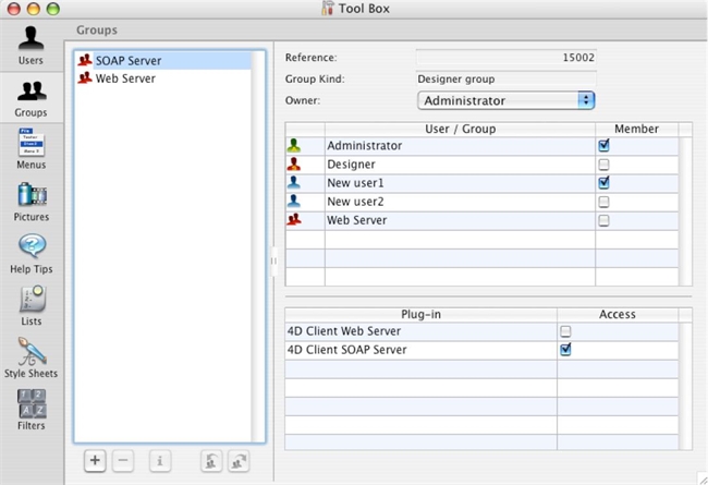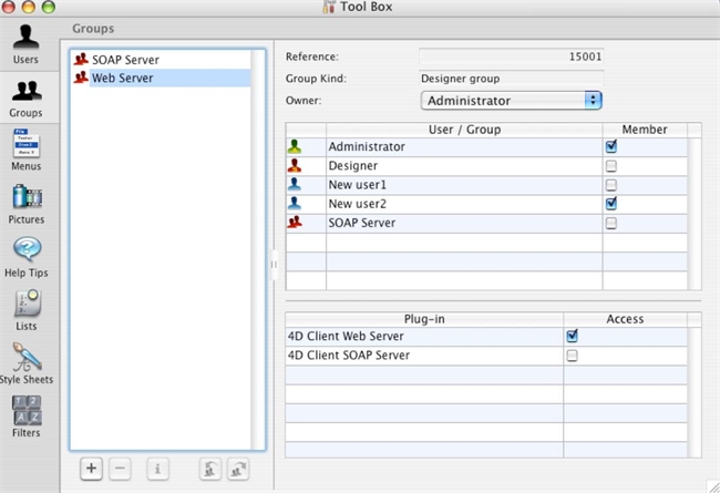 4D 2004 now allows the purchase of either a client Web Services expansion license or client Web Server expansion license. This gives the flexibility of using two different client machines and have them exclusively serve web pages or publish web services. In order to distinguish which client obtains which license, you will need to create groups.