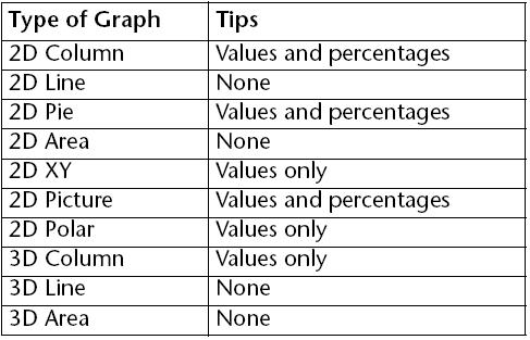 Tips are normally used to display information about an object. They are normally triggered when the mouse cursor hovers over an object. Below is a list of chart types and the information that can be displayed in the associated tips: