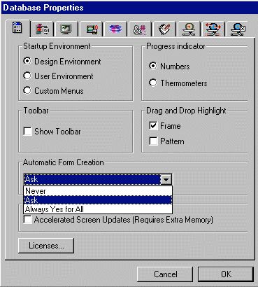4D 6.5.x offers a new feature when you automatically generate forms. You can now configure the automatic creation of forms. When you create tables in Design mode and go to the User mode, 4D tells you that no form has been created for the new table and offers to create a default input and output form. You can modify this feature so that 4D doesn't display this alert dialog box
