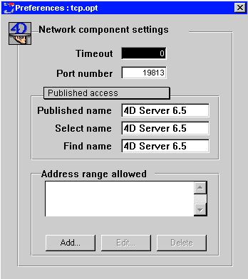 Customizer Plus allows the user to view or change 4th Dimension's default port number. From either the Macintosh or Windows platform, open the 'tcp.opt' file using Customizer Plus. The tcp.opt files can be found in the following locations on your computer: