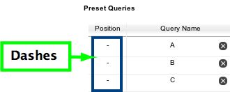 Once you create a preset query you will see your new query listed in the Control Panel. Notice that dashes are displayed under the Position column: