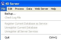 In order to use the "Register as a Service" feature for 4D Server on a Windows machine, the 4D Server application needs to be launched by an administrator-type user. Thus, one must log into the Windows operating system with a user that is in the local Administrators group for the machine. If a user with no administrative privileges tries to register a database as a service, the following is presented in the menu: