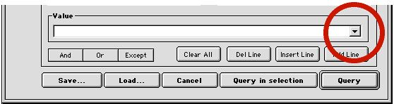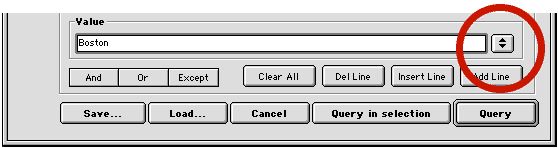 In 4D version 6.5, when the user is going to enter a value to search on in the Query dialog, a popup/drop down list is added to the right of the value field.
