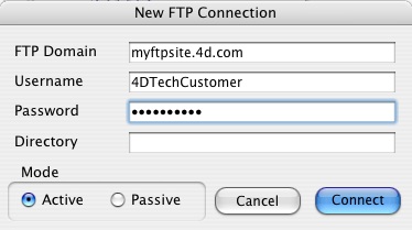 Once you have unstuffed this database all you need to do is run it in the latest version of 4D and go to the FTP Client screen at startup of the database, click the FTP Client button, and input your FTP information. Repeating a previous example from this tech tip you would input in the fields as follows: