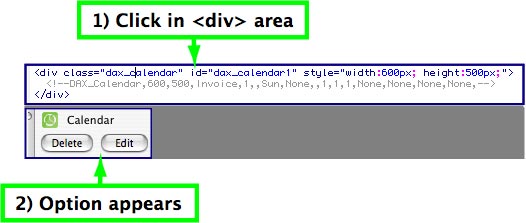 To do so, click within the DIV attribute of the 4DAF object. DIV attributes are found within the BODY element of the HTML page. Clicking within the DIV attribute of the 4DAF object opens up a dialog that is provides the option to edit or delete the object as shown below: