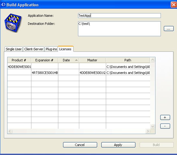 The Build Application dialog allows you to adjust settings for your merged application. Once you have adjusted these settings, go to the Licenses tab. Using the plus symbol button you can add your Runtime Volume license.