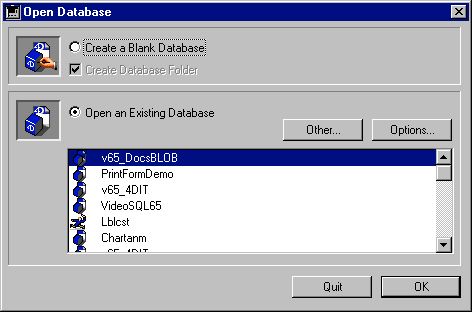 If you use the option to "Open an Existing Database," you can select a database from the dialog's list of your most recently accessed databases. After highlighting the name of one of the databases in the list, you can click the "Options..." button. This opens a new dialog that displays the path to the structure file and data file to be opened: