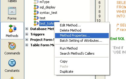 First, locate the method that will be called from the SQL query. Right click (Windows) or Ctrl + click (Mac OS) the method and select Method Properties: