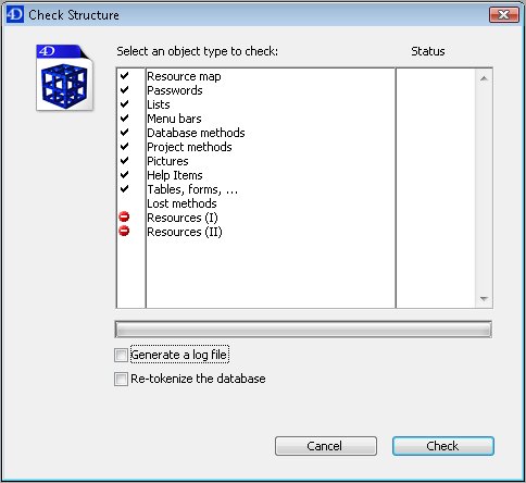 In 4th Dimension 2004 there is a "Check Structure" dialog that is accessible when you launch a database. From this dialog you can perform a few maintenance and troubleshooting procedures.