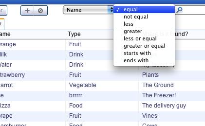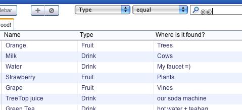 In my example I chose the "Type" field and searched for anything that had the letter "i" in it. You can see my results have been filtered to "Drink" and "Fruit" type entries.