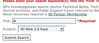 Let's say we want to search the Knowledge Base for anything related to 4D Web 2.0 Pack. If we only choose the product with nothing in the required Find: field, the search will not let us proceed.