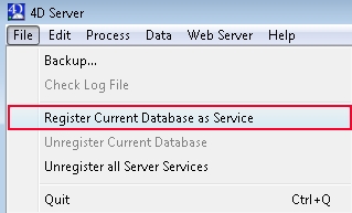 The first thing you will need to do is register the database as a service (Note: Only one database can be registered as a service per machine). To do this choose "Register Current Database as Service" from the File drop down menu of 4D Server: