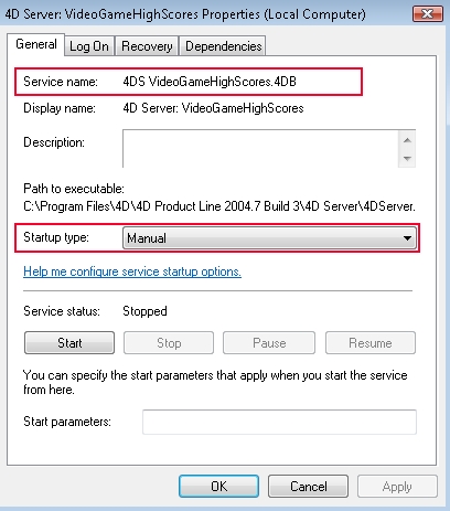 Right-click on the display name "4D Server: {Publication Name}" (in this example our service is displayed as "4D Server: VideoGameHighScores") and choose Properties. From the properties window for the service you can set the service to startup automatically by changing the "Startup type" drop down field to Automatic. To start or stop the service from the command line you will need to know what the "Service name" is, this is different than the "Display name" - both can be obtained from the Service Properties window: