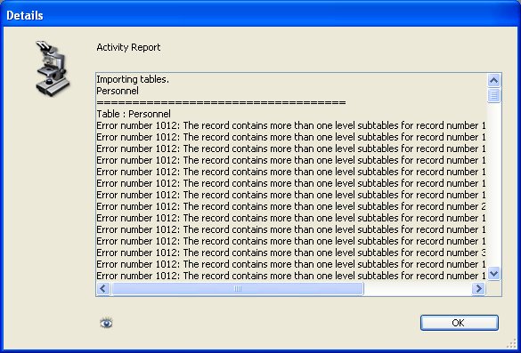 - Subtables beyond the first level are removed during conversion. 4D will display a dialog with information about the lost data during the conversion process. Here is an example: