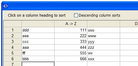 | `SortColumn method... `Event parameters C_BOOLEAN($0) C_LONGINT($1;$2;$3;$4;$5;$6) If($5=0) `If row 0, i.e. column header, was clicked $0:=True `Don't take event into account End ifC_BOOLEAN(check1) `Checkbox on form $order:=0 If(check1) `Descending is checked $order:=1 End if PV SORT ONE(area1;1;1;3;6;1;$4;$order) `Sort area from col 1, row 1 to col 3, row 6 `Sort columns ascending, keyed to column clicked `First erase existing column headings For ($i;1;3) PV SET COLUMN HEADER(area1;$i;" ") End for $title:="A -> Z" If(check1) `Descending checked $title:="Z -> A" End if PV SET COLUMN HEADER(area1;$4;$title) |