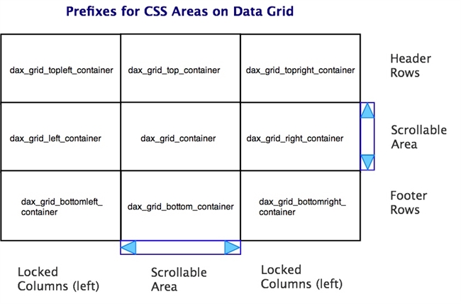 When overriding the Data Grid's CSS you can use the .dax_datagrid prefix to override the Data Grid object as a whole. To override a specific area on the Data Grid it helps to know what prefixes apply to which specific area. The following graphic breaks these areas down:
