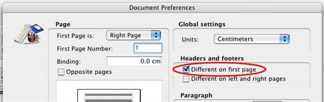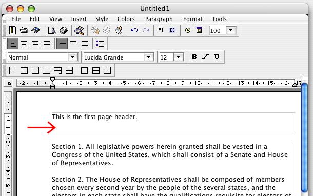 By default this header will appear on every printed page. But if a unique first page header is desired, that preference can be specified by selecting the File..Preferences menu, and selecting the "Different on first page" checkbox under "Headers and footers":