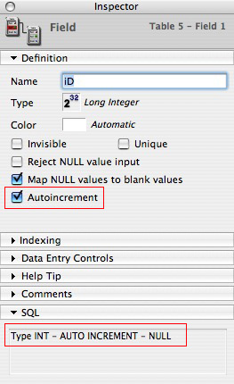 To set a field to Autoincrement, use the Inspector of the Structure editor.