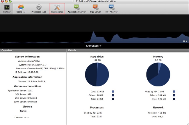 The 4D Server Administration window will appear. Select the Maintenance Tab as shown here, then click the "Compact Data..." button.