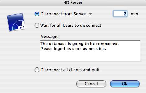 When you select "Disconnect all clients and quit" and press the "OK" button all clients will be closed and the compacting procedure will start. If you would like to give the clients a warning you can choose one of the other options.