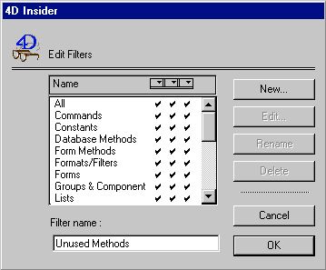 In 4D Insider, you can add your own filters to find common methods or objects that are meaningful to your particular database. For example, you may want to find local and interprocess variables. 4D Insider provides a filter for finding variables, but you can create additional filters for finding local variables (beginning with the "$" symbol) or interprocess variables (beginning with the "<>" symbol). Using filters to find objects meaningful to your database can be a particularly powerful feature if you use consistent naming conventions. For example, you might prefix all methods connected to menus with "M_". In this case, you could simplify your work with menus by defining a filter that finds methods beginning with "M_".