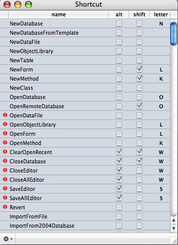 Take care when modifying the shortcuts, so that duplicate shortcuts are not created. The 4D Pop Shortcut Editor will denote duplicates with the red exclamation point.