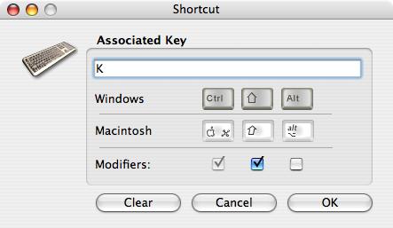 The other way is to use the 4D Pop Component. You can find the 4D Pop Component in your 4D v11 SQL installation's "Components" folder. When the component is installed, select "Migration and Edit shortcuts.." from the 4D Pop menu bar. This shows the Shortcut window: