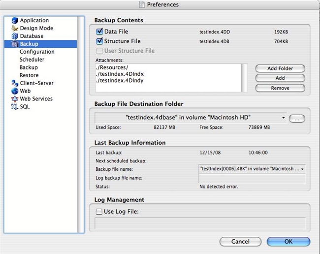 In our example both index files testindex.4DIndex and testindex.4DIndy are included in the Attachment list: