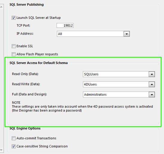 For more information on limiting database access in general (outside the SQL Server) see the Tech Tip on changes to User Access in 4D v11 SQL.
