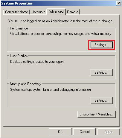 To add an exclusion, open the Control Panel and choose System and then click on the link for Advanced System Settings from the left hand side of the window; this will bring up the Advanced System Properties window. Click on the Settings button under Performance: