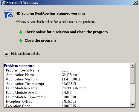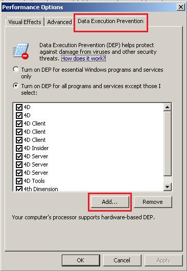 It is best practice to have every 4D product used on this machine added to the exceptions list (if DEP is enabled). For more information on how to troubleshoot whether DEP is really the problem see the Compiled Application not launching on Windows Vista (DEP) Tech Tip.