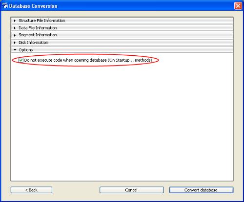 When the "Do not execute code when opening database (On Startup... methods)" option is checked, all of the code of the On Startup method will be deactivated when the converted database is launched for the first time.