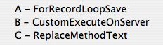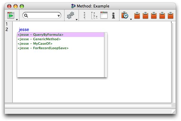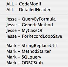 The last example can be very useful for team development when each developer has their own macros that they prefer. This also comes in very handy when using type-ahead. A developer's macros can be quickly acessed simply by typing their name, initials, or other unique identifier into the method editor.