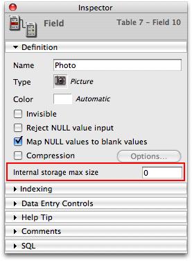 Versions of 4D v11 SQL previous to 11.4 allowed you to set the Internal storage max size for BLOB and Picture fileds.