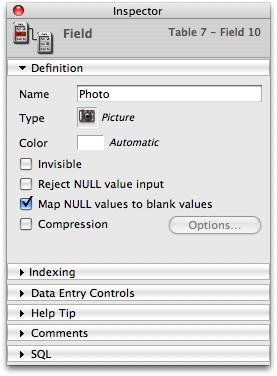 In 4D v11 SQL, BLOB and Picture fields are always stored outside of records. Therefore, this option no longer exists in the Inspector for BLOB and Picture fields.