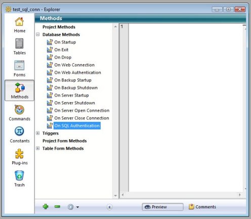 This is normally an obvious situation and the intended behavior, but for developers who use 4D's User and Password system for access, the On SQL Authentication method is unnecessary. In this case it must not exist. Sometimes the On SQL Authentication can be accidentally created and left blank. This is easy to overlook. The following two screenshots show examples of the difference between a blank On SQL Authentication method and a non-existent one: