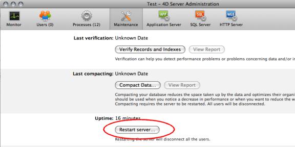 However it is important to note that this restart is not exactly the the same as a full restart of 4D. Primarily you may notice that the memory used by the server does not change. For example, if the server had allocated 1GB of memory before the restart, it may still appear to be using that same 1GB of memory. In fact the memory will stay allocated (this is more efficient) and will be re-used.