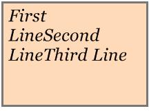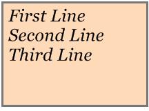 | <svg xmlns="https://www.w3.org/2000/svg"> <rect fill="peachpuff" height="150" rx="0" ry="0" stroke="#777" stroke-width="3" width="210" x="5" y="5"/> <textArea font-family="Georgia" font-size="25" font-style="italic" height="150" text-align="justify" width="200" x="10" y="10">First Line<tbreak/>Second Line<tbreak/>Third Line</textArea> </svg> |