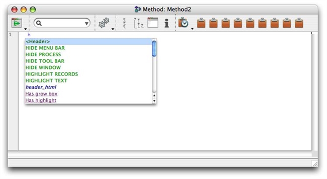 Though it is not recommended, macros can have the same name as project methods or project methods have the same name as a 4D command. The user needs to differentiate between the possibilities. For example: In the method editor, if you type the letter H and press the Tab key, a list similar to the following is displayed.