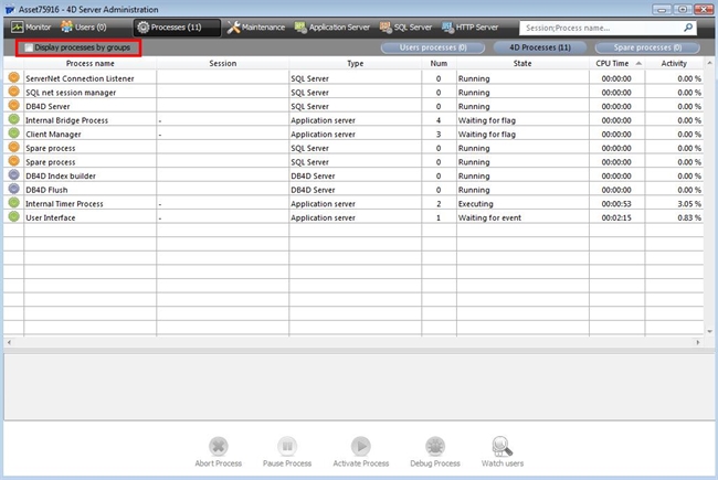 4D Server provides a list of running Process within the Administration Window. In order to make the results more valuable, it is suggested to uncheck the option to "Display process by group" thus displaying each individual process: