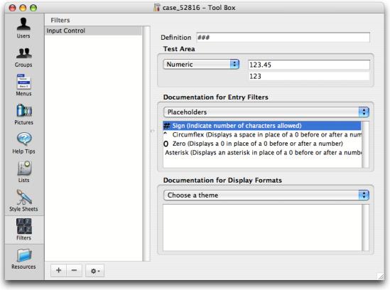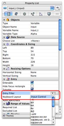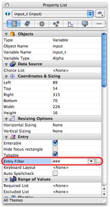 In 4D v11 SQL you can limit the length of an entry string into a text variable to a certain number of characters using the entry filter property for this variable. For example, say we want to limit the length to three characters in the text variable named input_t.