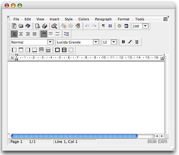 A default 4D Write area contains menu items, toolbars, text formatting tools, scroll bars and a status bar as shown here: