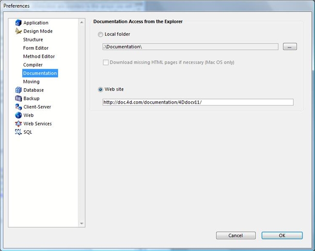 The "Documentation Access from the Explorer" window is found from within the 4D Preferences menu from: "Design Mode" -> "Documentation" as depicted in the following screenshot: