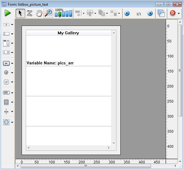 The data source for this List Box is arrays, and there is only one column, "pic_arr" which is of type Picture. That is the gallery of images. Next make sure you have a Pictures folder in your resources folder with images. These are the images used in this sample: