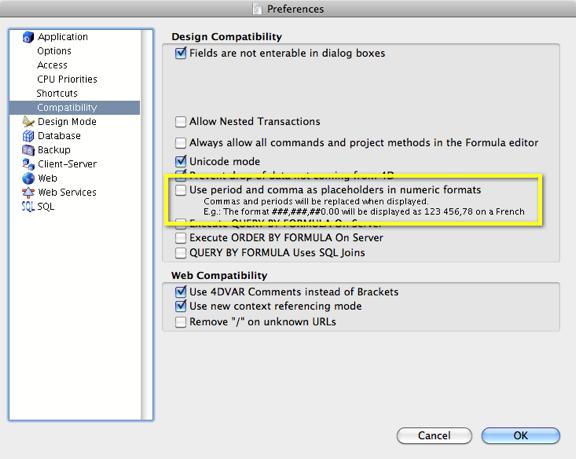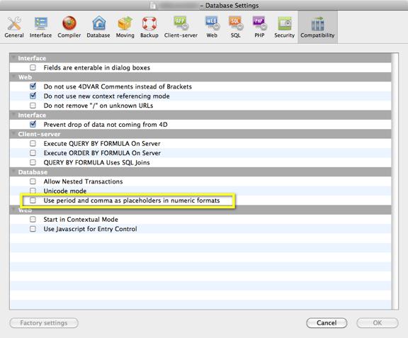 When converting a database from 4D 2004 (or earlier) to 4D v11 SQL or 4D v12, a change in how the newer versions handle format strings is important to note. In the 4D v11 SQL Upgrade Manual the following paragraph announced the change in how format strings are handled. In 4D versions prior to version 11, it was up to the developer to set format strings to the correct regional settings.